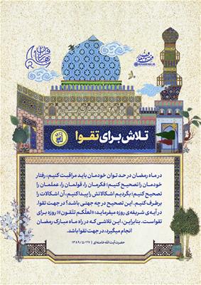 حضرت آیتالله خامنهای: در ماه رمضان در حد توان خودمان باید مراقبت کنیم، رفتار خودمان را تصحیح کنیم؛ فکرمان را، قولمان را، عملمان را تصحیح کنیم؛ بگردیم اشکالاتش را پیدا کنیم، آن اشکالات را برطرف کنیم. این تصحیح در چه جهتی باشد؟ در جهت تقوا. در آیهی شریفهی روزه میفرماید: «لعلّکم تتّقون»؛ روزه برای تقواست. بنابراین، این تلاشی که در راه ماه مبارک رمضان انجام میگیرد، در جهت تقوا باشد. 1389/05/27