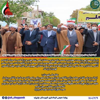 فرماندار شهرستان چایپاره با صدور پیامی از حضور گسترده و باشکوه مردم این شهرستان در راهپیمایی روز جهانی قدس تقدیر و تشکر کرد.