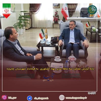 به گزارش روابط عمومی فرمانداری شهرستان چایپاره ؛ در راستای اهداف عالی دولت مردمی ، دولت سیزدهم به منظور ارتقاء سطح رضایتمندی عمومی از خدمات ادارات و نهادهای دولتی و عمومی شهرستان ، صبح امروز 1401/4/7 صمد دادگر مدیر جهاد کشاورزی شهرستان با حضور در دفتر سعید شکورزاده فرماندار شهرستان ، ضمن دیدار به ارائه گزارش عملکرد خود پرداختند.
