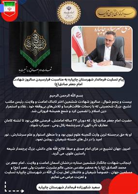 پیام تسلیت فرماندار شهرستان چایپاره بهمناسبت فرارسیدن سالروز شهادت امام جعفر صادق(ع)