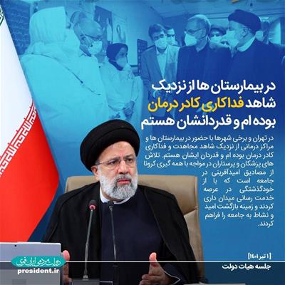تلاشهای پزشکان و پرستاران در مواجه با همه گیری کرونا از مصادیق امیدآفرینی در جامعه است/ فراهم شدن امکان بازگشایی صنوف و ایجاد نشاط در کشور ثمره همراهی مردم و مجاهدت کادر درمان بویژه شهدای سلامت است/ شهید چمران و سردار سلیمانی الگوهای امیدآفرینی هستند