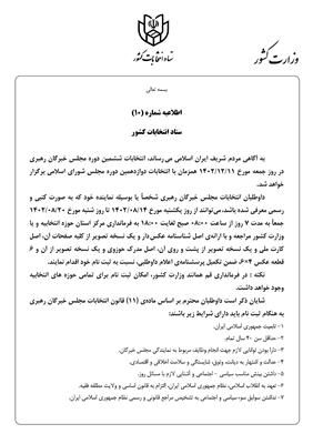 اطلاعیه شماره 10 ستاد انتخابات کشور