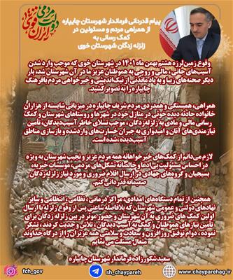 به گزارش روابط عمومی فرمانداری شهرستان چایپاره؛ فرماندار چایپاره با صدور پیامی از همراهی و همبستگی صمیمانه اقشار مختلف مردم ، گروه های جهادی ، تشکلهای غیردولتی و ادارات و نهادهای دولتی و عمومی شهرستان چایپاره در کمکرسانی به زلزلهزدگان شهرستان خوی قدردانی کرد.