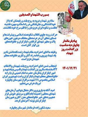 به گزارش روابط عمومی فرمانداری چایپاره «سعید شکورزاده»، در پیامی 22اسفندماه روز بزرگداشت شهدا و سالروز تأسیس بنیاد شهید و امور ایثارگران را گرامی داشتند .