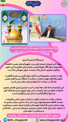 پیام تبریک فرماندار شهرستان چایپاره بهمناسبت فرارسیدن سالروز ولادت باسعادت حضرت معصومه(س) و روز دختر