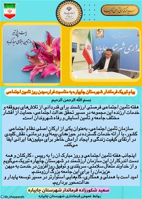 پیام تبریک فرماندار شهرستان چایپاره بهمناسبت فرارسیدن روز تأمین اجتماعی