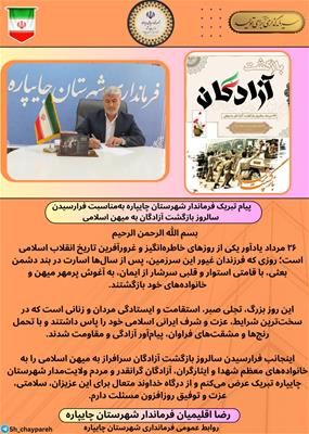 پیام تبریک فرماندار شهرستان چایپاره بهمناسبت فرارسیدن سالروز بازگشت آزادگان به میهن اسلامی