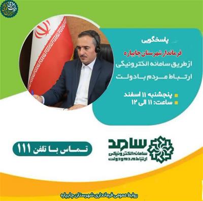 ه گزارش روابط عمومی فرمانداری شهرستان چایپاره؛ صبح روز پنجشنبه 12 اسفند ماه 1401 فرماندار چایپاره از طریق سامانه الکترونیکی ارتباط مردم با دولت پاسخگوی سوالات شهروندان خواهند بود.