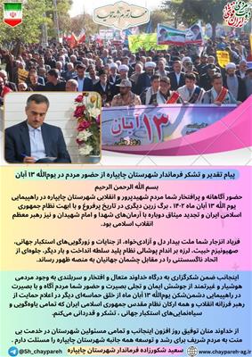 مراسم یوم الله 13 آبان ، با شعار محوری «نظم نوین جهانی با نسل آرمانی » با حضور گسترده و پرشور اقشار مختلف مردم شهرستان چایپاره اعم از دانش آموزان ، دانشجویان ، فرهنگیان ، اساتید ، بازاریان ، کشاورزان ، هنرمندان ، ورزشکاران ، بسیجیان ، کارمندان ، کارگران ، نیروهای نظامی و انتظامی همزمان با سراسر کشور برگزار شد.