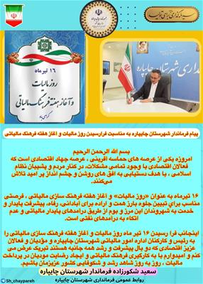 پیام فرماندار شهرستان چایپاره به مناسبت فرارسیدن روز مالیات و آغاز هفته فرهنگ مالیاتی