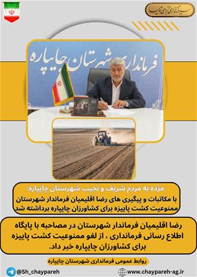 با مکاتبات و پیگیری های رضا اقلیمیان فرماندار شهرستان ممنوعیت کشت پاییزه برای کشاورزان چایپاره برداشته شد- پنج شنبه 10 مهر 1404 ساعت 08:00