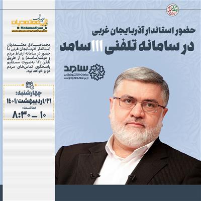 محمدصادق معتمدیان استاندار آذربایجان غربی روز چهارشنبه 21 اردیبهشت ماه 1401 از ساعت 8:30 الی 10 با حضور در سامانه ارتباط مردم و دولت (سامد) و از طریق تلفن 111 بهصورت مستقیم پاسخگوی تماسهای مردم عزیز استان خواهد بود.