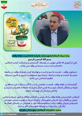 فرماندار شهرستان چایپاره در پیامی هفته وقف را تبریک گفت.