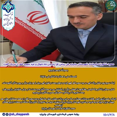 به گزارش روابط عمومی فرمانداری چایپاره ، متن پیام تبریک فرماندار شهرستان که به مناسبت عید سعید فطر صادر شد، به شرح زیر می باشد: